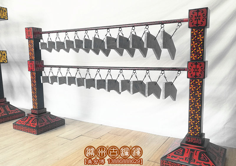 隨州市古編鐘文化發(fā)展有限公司通過考證歷史資料進行研究分析,并八方尋找石源,終于將這套2400多年前的戰(zhàn)國初期大型編磬復(fù)制出來,其發(fā)音與原編磬的標(biāo)音銘文相符,低音渾厚洪高,高音明澈,音色優(yōu)美而動聽,音域達三個八度,可以旋宮轉(zhuǎn)調(diào),演奏多種樂曲。