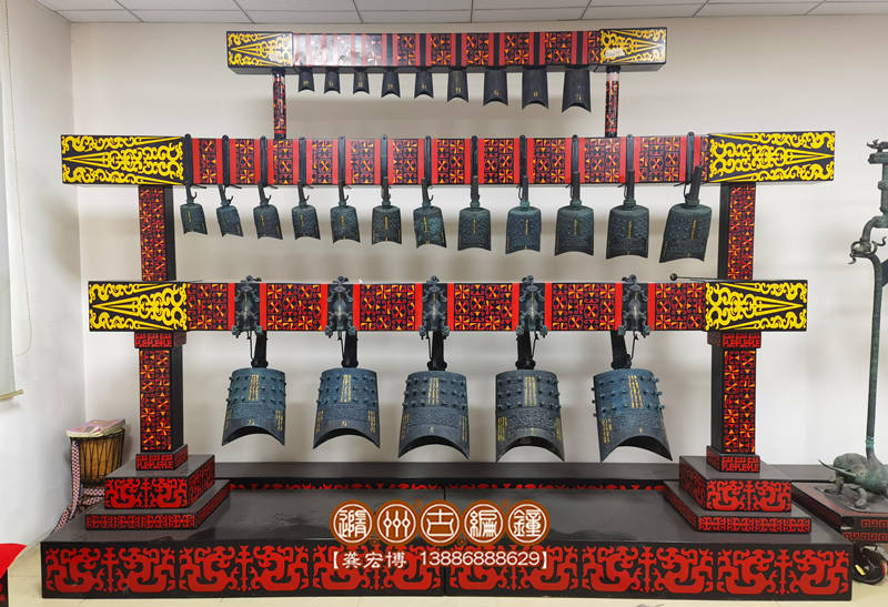 26件木結構演奏級編鐘,是一套專業(yè)演奏類古樂器,整套編鐘分3層懸掛排列,由長短不同的三根彩繪橫梁和4個青銅佩劍武士立柱及2根圓立柱組成。編鐘由錫青銅鑄造而成,采用國際標準樂音音高A=440Hz調音,一鐘雙音,十二半音齊備,可以旋宮轉調演奏古今中外樂曲。編鐘下層懸掛5件倍低音甬鐘,音色低沉渾厚,在演奏中起烘托作用,使用鐘棒撞擊發(fā)音。中層12件編鐘從大到小依次排列,音色淳樸清澈,用于演奏樂曲主旋律。上層9件為倍高音鐘,音色清脆悅耳,用于演奏高音及復試旋律搭配。編鐘的彩繪橫梁采用優(yōu)質實木板制作,表面噴漆并彩繪花紋;整套配套演奏工具一套,教學樂譜,另配有保管編鐘用的木箱,便于運輸和儲存。